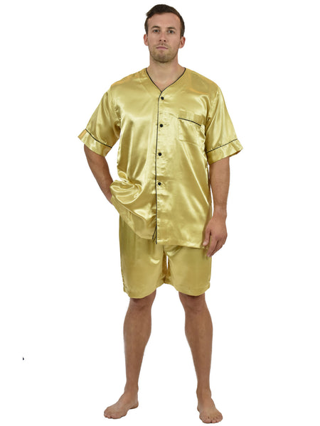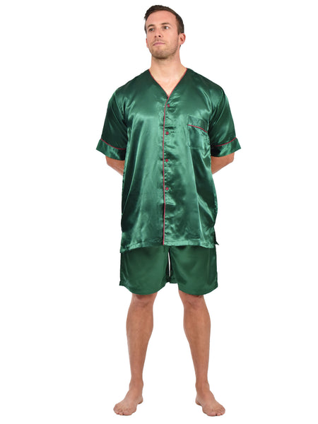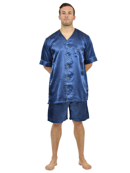 Our Men's Satin Short-Sleeve V-Neck Pajama Set with Shorts is made of lightweight polysatin (100% polyester) with the look and feel of silk. Featuring a comfortable elastic waistband and a front pocket on the chest, these men's pajamas come in medium, large, and extra-large sizes and are easily cared for with regular machine washing and ironing with a silk setting. You'll look and feel great and sleep well in these and our other men's pajama sets.