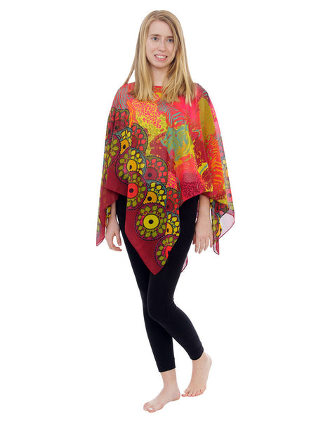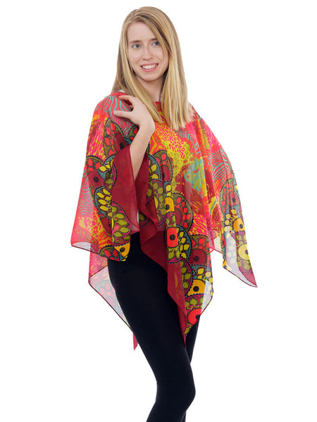Our Women's Sunset Safari Print Poncho is a colorful, free-spirited fashion accessory that looks great worn over dress pants, jeans, shorts, and skirts. Made of extremely lightweight, see-through, polyester, silky soft chiffon, this women's poncho has a comfortable nine-inch neck opening and no side seam and is easily cared for with regular machine washing. With a length and width of 64 inches and a top-to-bottom measurement of 26 inches, this poncho fits women of most sizes from extra small to extra large.